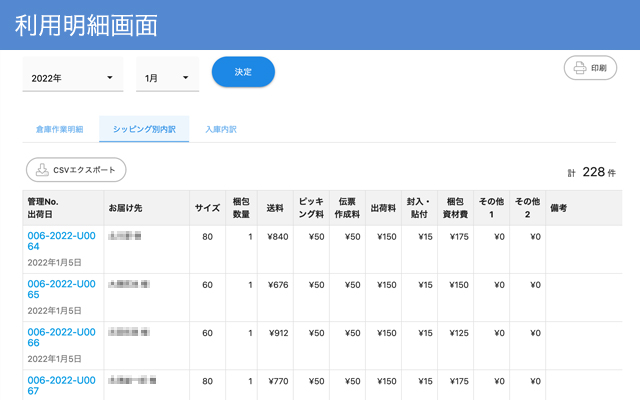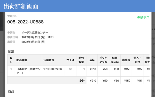 在庫数・入庫依頼・出荷情報などの物流工程をまとめて管理。さらに、出荷ごとの利用明細・配送会社の伝票番号がいつでも確認でき物流業務の見える化を実現。