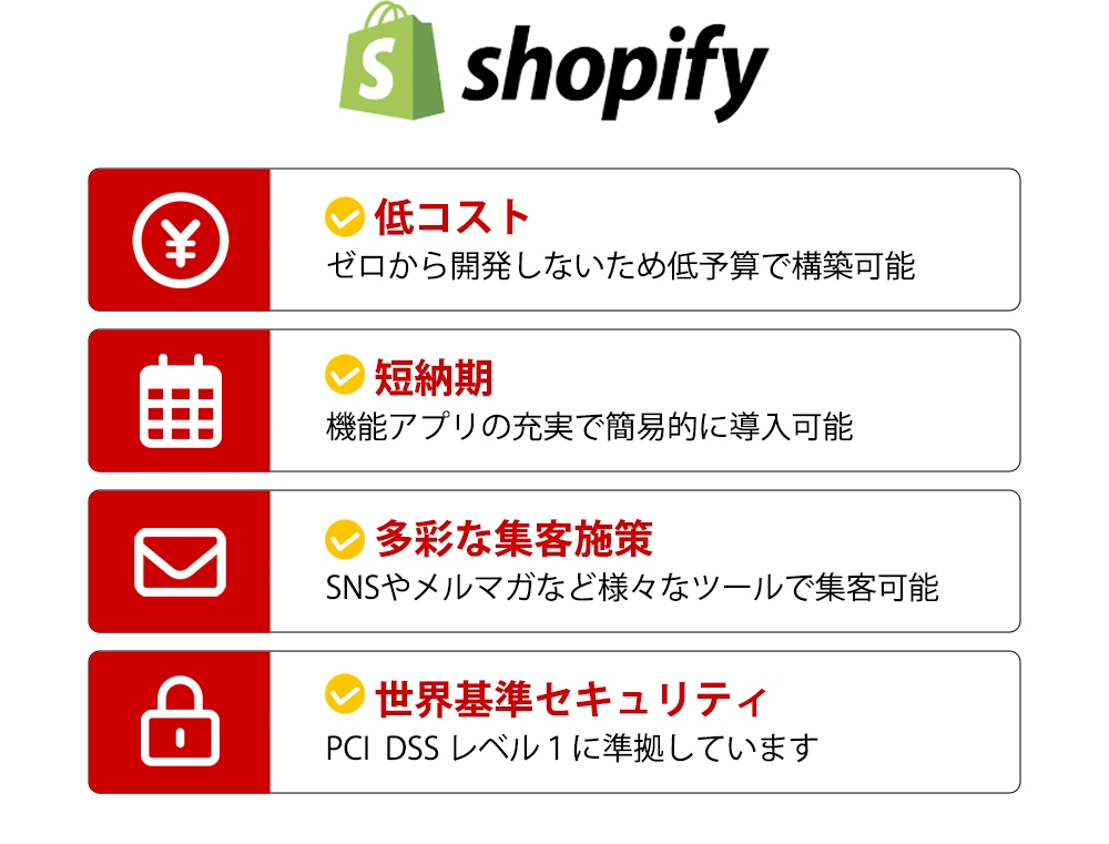 Shopifyの強みは低コストで構築でき、集客に特化しているため売上増が見込める点です。