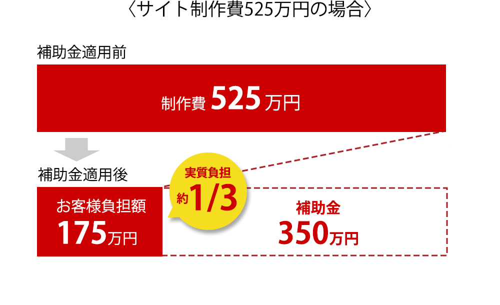IT導入補助金を利用することで、補助額50万〜350万円の2/3が補助され、コストが高いECサイトもお得に制作することができます。